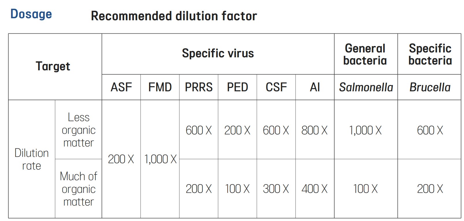 In case of disinfecting several diseases at the same time, dilute the product with the lowest dilution factor (high concentration).