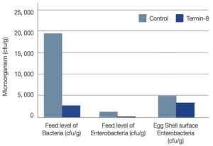 Conclusion: Treating the feeds with Termin-8 improved feed quality and egg hygiene.