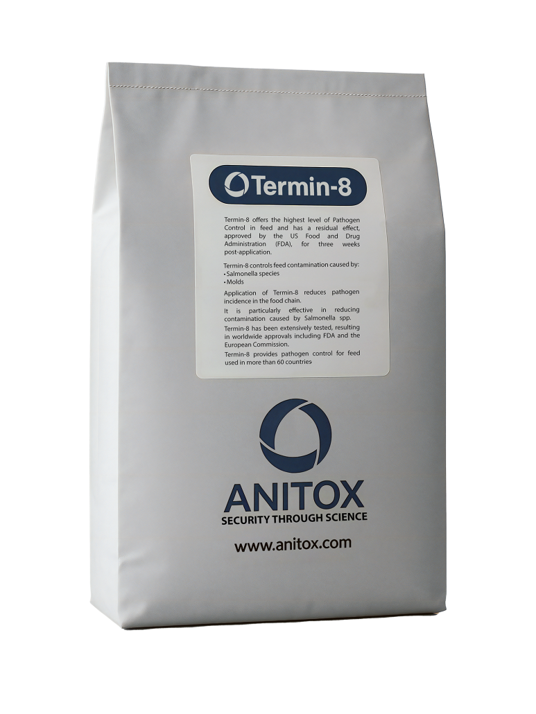 Termin-8 offers the highest level of pathogen control in feed and provides a residual effect, approved by the US Food and Drug Administration (FDA), for up to three weeks after application. Termin-8 is highly effective in controlling feed contamination caused by pathogens, including Salmonella species and molds.
